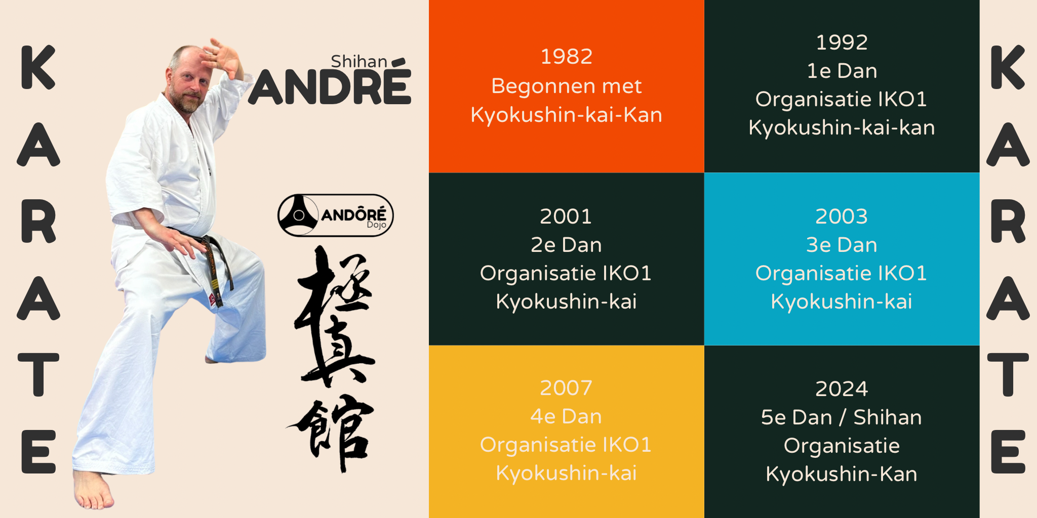 Shihan André heeft meer dan 40 jaar, kyokushin trainingen achter zich en is nog altijd lerende. Hij is het levende bewijs dat Kyokushin karate een on uit puttende bron van kennis is, waarmee je jezelf op fysiek, mentaal en spiritueel niveau kan blijven ontwikkelen. Deze denkwijze deelt Shihan met de Kyokushin-Kan organisatie onder leiding van Kaicho Royama. Kaicho Royama is de oudst levende leerling van de grondlegger van het Kyokushin-karate (Mas. Oyama).