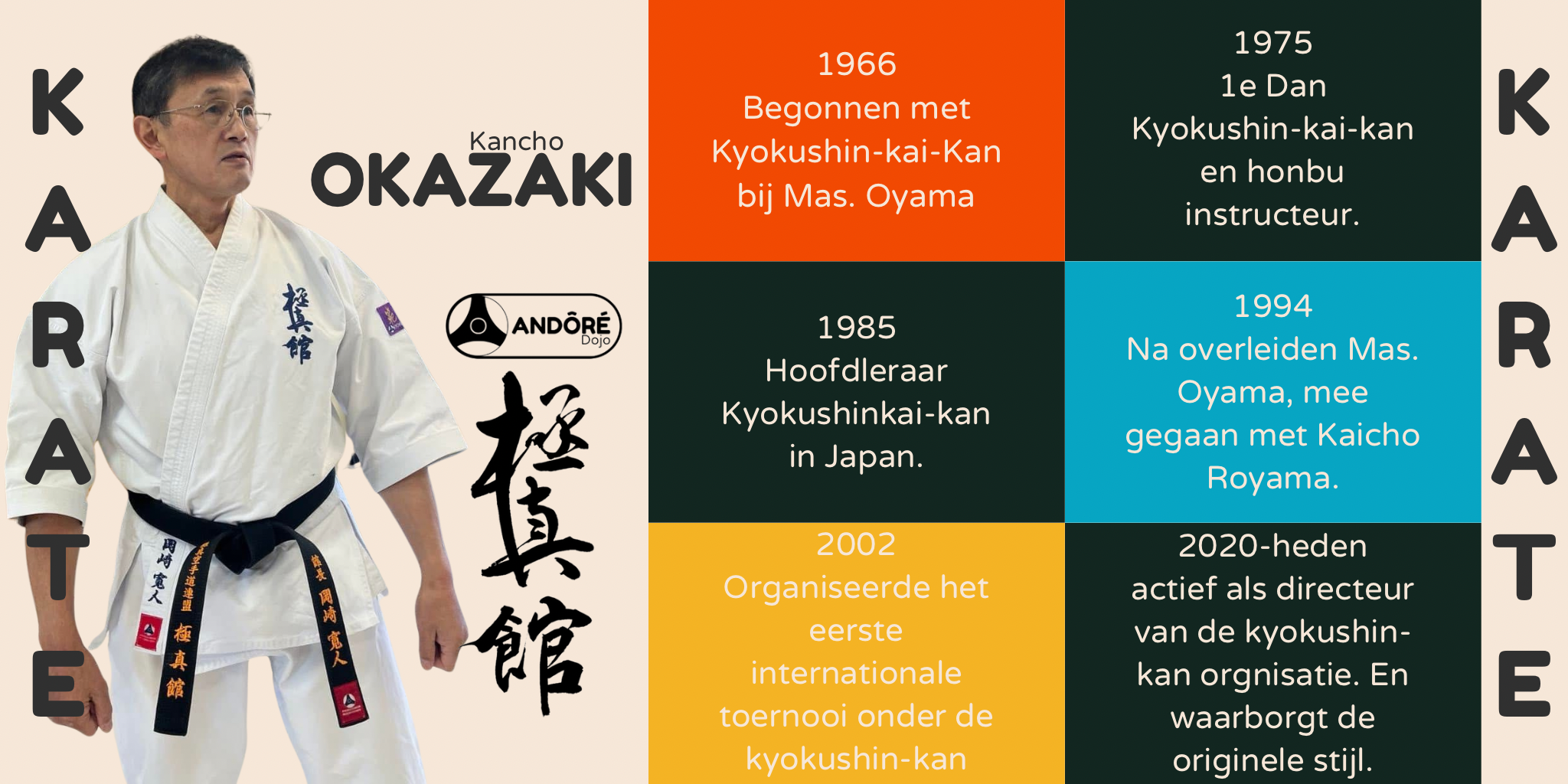 Kancho Okazaki is een invloedrijke leider binnen de Kyokushin karate gemeenschap en mede oprichter van de Kyokushin-kan organisatie. Hij begon zijn trainingen in Kyokushin onder Masutatsu Oyama en ontwikkelde zich tot een hooggekwalificeerde karateka. Na de dood van Oyama in 1994, ging Kancho Okazaki mee met Kaicho Royama en bouwde aan de Kyokushin-Kan organisatie.