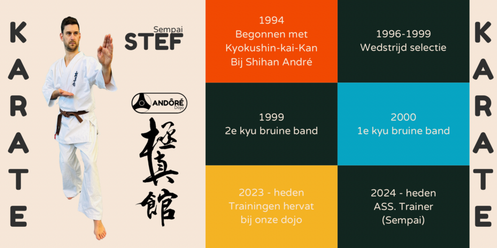 Als Sempai assisteert Stef tijdens de trainingen en zo nodig neemt hij lessen waar als Shihan André verhinderd is. Stef geniet naast de reguliere trainingen ook een interne scholing voor karate docent, Kyokushin-Kan.